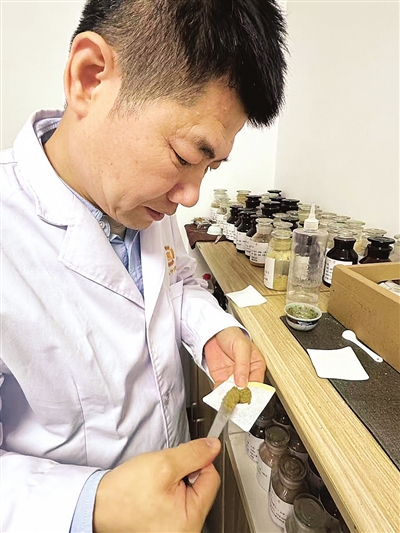 治疗室内,一组药柜格外醒目。大大小小的玻璃药瓶整齐排列,瓶中装着各种中药粉,每个瓶身上都标注着专属编号及主要成分。“这是我们的‘密码本’。”贾海兵幽默地说,“每个瓶身上的数字编号背后,都是一段传承故事的生动讲述。”