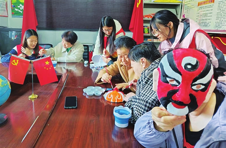 实践环节,志愿者为老人提供空白脸谱、颜料和工具,采取“一对一”模式辅导。在志愿者协助下,82岁京剧票友李奶奶完成“穆桂英”脸谱后,激动地说:“我年轻时在剧团画过布景,今天这堂课真过瘾!”随后,老人们手持作品登台,即兴演绎京剧《红灯记》《智取威虎山》选段,引发现场阵阵掌声。