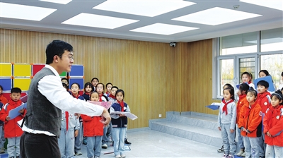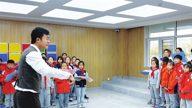 音乐教室里,50多个孩子排成合唱队形,眼睛里闪烁着期待的光芒,年轻的指挥家程欣奇开始了与孩子们的音乐对话。只见他轻轻抬手,整个教室瞬间安静下来,孩子们的目光追随着他的手势。“来,让我们先来感受一下音乐的呼吸。”程欣奇的手掌缓缓向上扬起,孩子们深吸一口气;手掌落下时,教室里响起整齐的呼气声。简单的互动,让每个孩子都进入了音乐的状态。