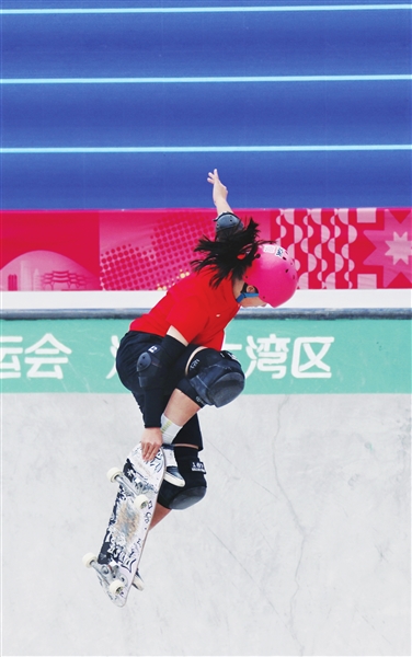 11月11日,第十五届全运会滑板女子碗池决赛在“滑板之城”惠州进行,14岁的山西小将韩岫芊澄获得女子碗池比赛第四名。