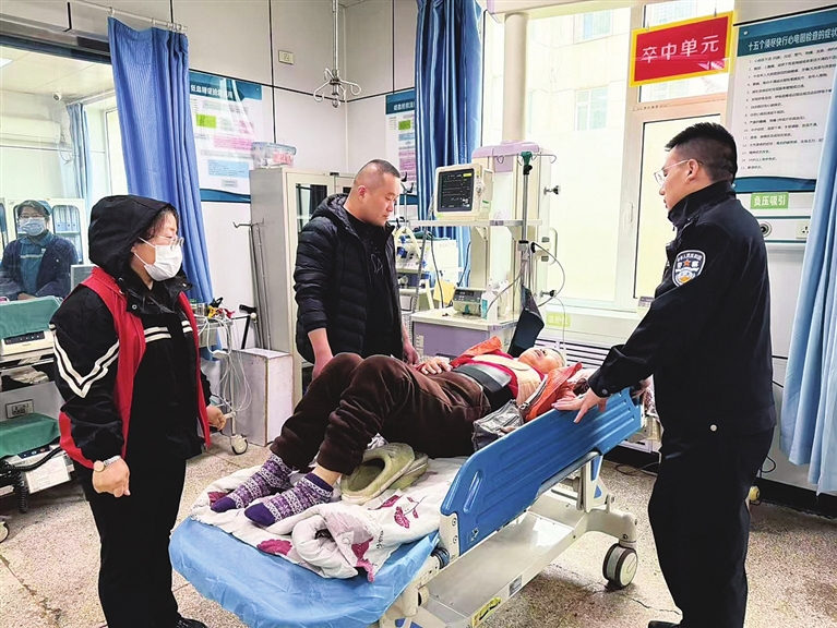 了解情况后,民警判断老人伤情不容拖延,马上拨打120急救电话,同时联系社区工作人员,请求协助开展后续处置工作。急救车抵达后,民警与社区工作人员、急救人员协作,小心翼翼地将老人转移至担架上,护送上救护车。到达医院后,老人被确诊为腰部高位骨折,需立即住院治疗,否则可能面临生命危险。