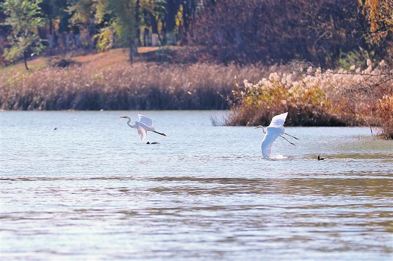 11月13日,汾河湿地公园内白鹭翩翩起舞,构成一幅和谐美丽的生态画卷。