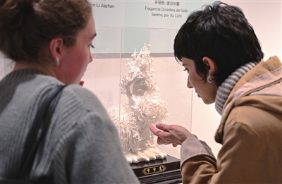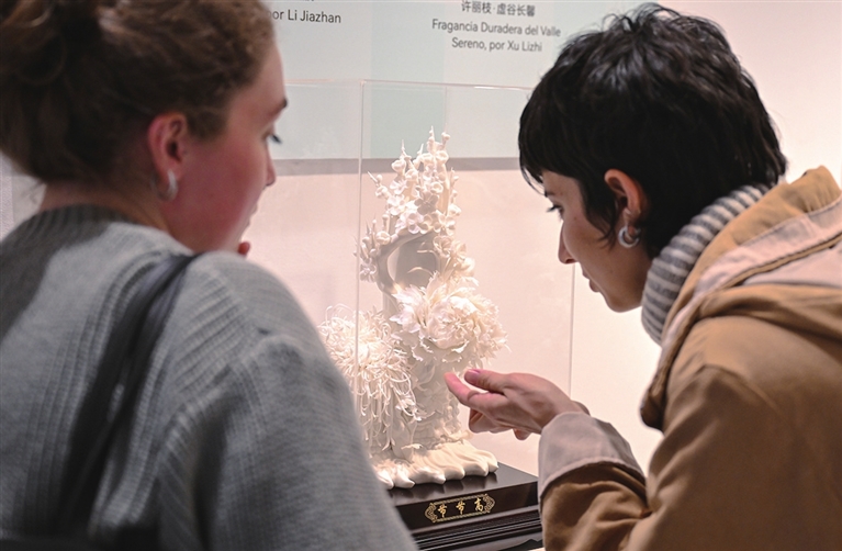 11月11日,“中国白·德化瓷”西班牙巡展在西班牙塔拉韦拉文化中心举行。观众在西班牙塔拉韦拉文化中心欣赏德化白瓷展品。 新华社 发