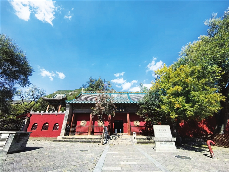 平坦宽阔的道路两边,是层层行道树。绚丽的紫叶李、绯红的黄栌、青翠的松树挨挨挤挤,一排排整齐的国槐在阳光下闪着金光,还有高大的杨树、婀娜的柳树,在秋风中摇曳生姿,给这条路增加了无限生机。西山巍峨,远望或明或暗的山坡和沟壑,山体被各种植物晕染,火红、橙黄、鹅黄、墨绿、金棕、浅褐、深褐……深深浅浅,好似层层锦缎,美得让人挪不开眼。从停车场下车步行,沿着幽静的小路不多久就来到了窦大夫祠的正门。