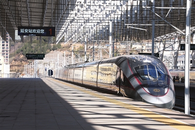 11月17日上午,55302次试验动车组沿着新建西安至延安高速铁路驶向延安站,这标志着西延高铁正式从联调联试阶段全面转入运行试验阶段,全线开通运营进入倒计时。西安至延安高速铁路是陕北革命老区的首条高铁,线路全长299.8公里,设计时速350公里。西延高铁开通后,西安至延安的铁路运行时间将从目前约2.5小时缩短至1小时左右。 新华社 发