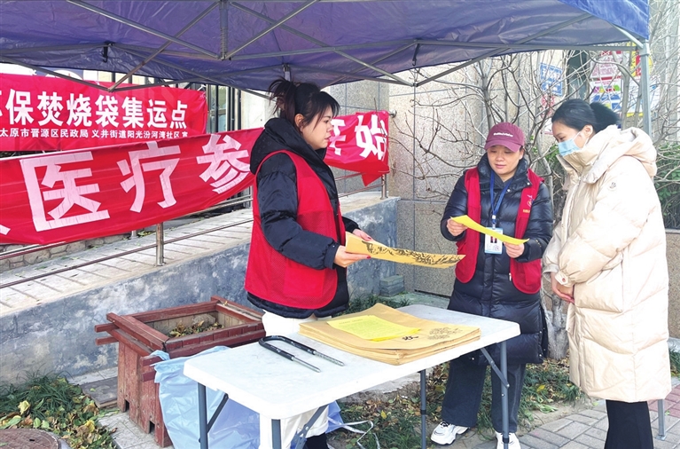 “阿姨,用这个焚烧袋祭祀既安全又干净,之后,我们会统一回收焚烧。”活动现场,网格员们手持宣传资料向过往居民细致讲解文明祭祀的环保意义与安全要点,并逐一发放《文明祭祀倡议书》和专用焚烧袋。高峰时段,网格员们分工协作、忙而有序。回收点位上,他们整理收纳焚烧袋,整齐堆叠后集中转运。遇到行动不便的老人,网格员们主动上前接过焚烧袋妥善收纳。