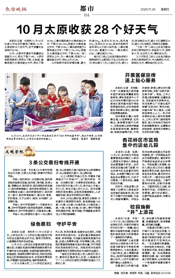 10月,太原市环境空气质量综合指数为3.67,同比下降17.9%。6项污染物浓度有5项同比下降,分别是:臭氧浓度为93微克每立方米,同比下降29.5%;二氧化氮浓度为32微克每立方米,下降25.6%;PM10浓度为58微克每立方米,下降19.4%;二氧化硫浓度为8微克每立方米,下降11.1%;PM2.5浓度为36微克每立方米,下降10.0%。有1项同比上升,为一氧化碳,浓度为1.2毫克每立方米,同比上升20.0%。