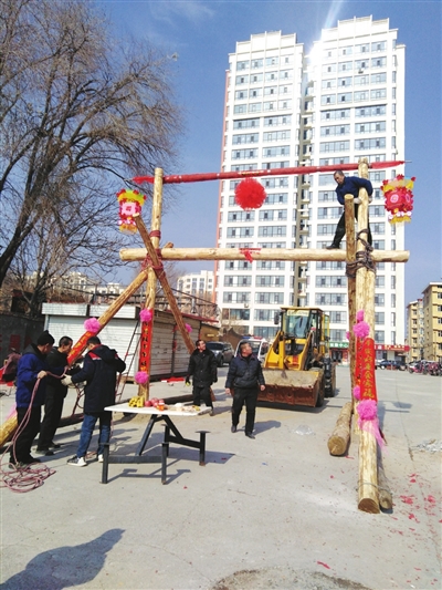 2022年新春伊始,尖草坪区上兰村的村民们便开始忙活起来。有的抬木椽,有的拿麻绳,还有的忙着置办各式绢花。很快村里空地中央就竖起了一个高约7米的大木架。这个被村民们称为“花花架”的木结构,是拔花花活动中必不可少的道具。活动令村民们格外期待,因为这是该项活动停办多年后再度举办,活动由太原市非遗保护中心、中北大学体育学院、尖草坪区文旅局会同上兰街道办事处、上兰村村委会等共同举办。