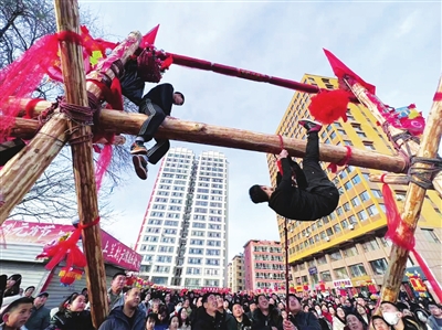 这场精彩的表演,正是太原市尖草坪区特有的民间体育竞技拔花花,是当地乡村在农历正月十五至二月初二农闲时节举办的民间社火活动。它起源于明清时期,集竞技性、民俗性、锻炼性、娱乐性于一体,充满了浓郁的乡土韵味。2009年,拔花花入选山西省第二批非物质文化遗产代表性项目名录。