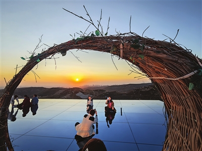11月19日,游客们在东山天空之镜欣赏绝美落日。该景点位于太原与晋中交界处的小西沟景区,通过镜面设计与藤编圆环、月牙形座椅等元素营造梦幻氛围,成为热门打卡地。