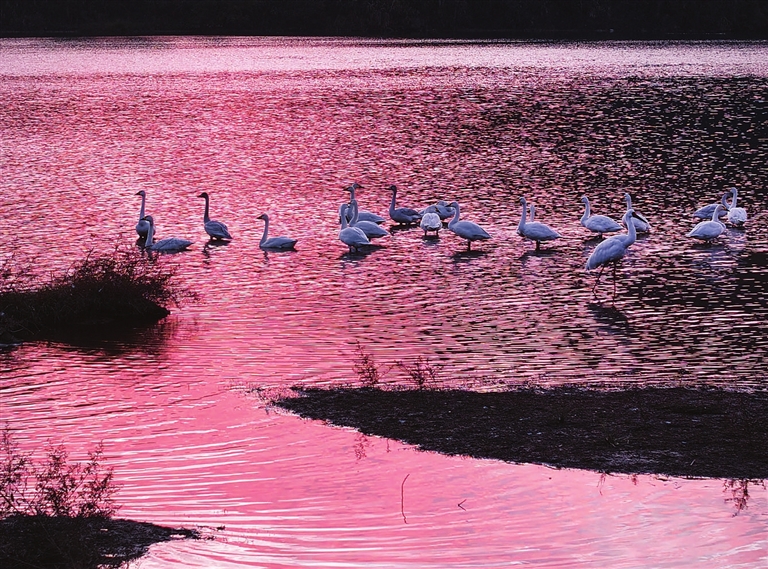 11月19日,福建武夷山国家公园一号风景道旁,一群天鹅在水面栖息(无人机照片)。
