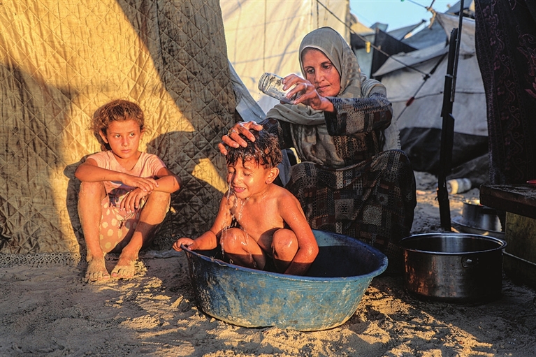 2025年7月18日,在加沙地带北部加沙城,巴勒斯坦儿童在临时帐篷外洗澡。