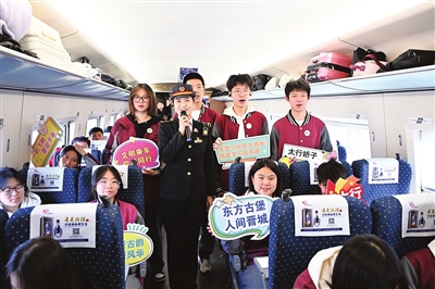 11月22日,我省首次开行的高铁研学专列4905次列车从太原南站启程,载着556名师生赴晋豫开展3天研学。乘务员兼任导游与宣传员,在车厢内举办“穿梭三晋,感知中国速度”公开课。太原局表示,将持续推出定制化客运服务,助力旅游经济与银发经济的发展。 耿婧媛 齐向真 摄影报道