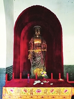大雄宝殿的三尊佛像,其中以阿弥陀佛立式铜像工艺最为精湛,堪称明代铜造像的经典。佛像高3.85米,全身贴金,头梳螺髻,身披通肩袈裟,内穿下衣,腰系软带于腹前打结,左手仰于腹前,中指弯曲,右手向下,五指舒展。佛像面相方圆,宝相庄严,两耳垂肩,眉骨弯曲,眼神下视,凸鼻圆润,口形偏小,下巴处皱纹如月。