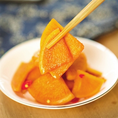 芥菜的根茎俗称“芥疙瘩”,有独特的鲜醇气味。连《千字文》中都说,“果珍李柰,菜重芥姜”。人们将其洗净晾干后入缸,加入辣椒、生姜,用花椒、大料、茴香熬制的腌汤浸泡,石板盖严。待来年启封,可直接吃,咸香扑鼻;也可捞出煮熟,切成片或小段晾晒至半干,嚼劲十足,又多一份干香,是拿肉都不换的美味。