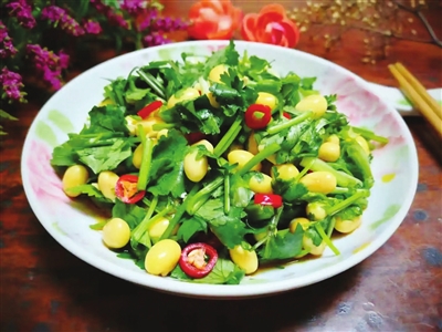 芫荽豆豆是黄豆与芫荽的相遇。黄豆泡发后与小茴香、花椒大料同煮,再与切碎的芫荽拌匀入坛,即刻可食,清香爽口。