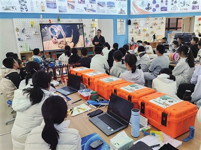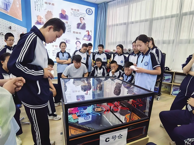 “学校开设了科学教育校本通识课,这是初一年级的必修课,每周每班一节,通过这样的基础普及课,让学生对科学课程形成初步认识。课后,学生可依兴趣加入不同社团,在深度实践中解锁科学奥秘。”学校创新教育中心主任燕波介绍。