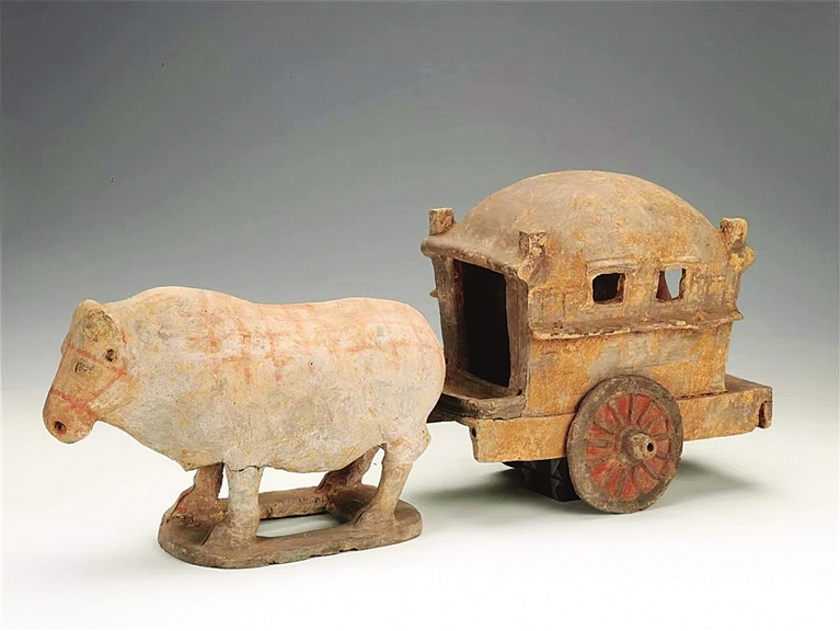我们看到的这辆陶牛车属鳖甲车一类,因车盖隆起形似鳖甲得名。根据其出土摆放位置,专家认为这辆车应是墓主人所乘之车。