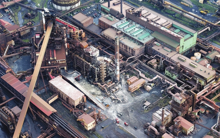 这是12月1日在日本北海道室兰市航拍的室兰市日本制铁公司北日本制铁所工厂火灾后景象。