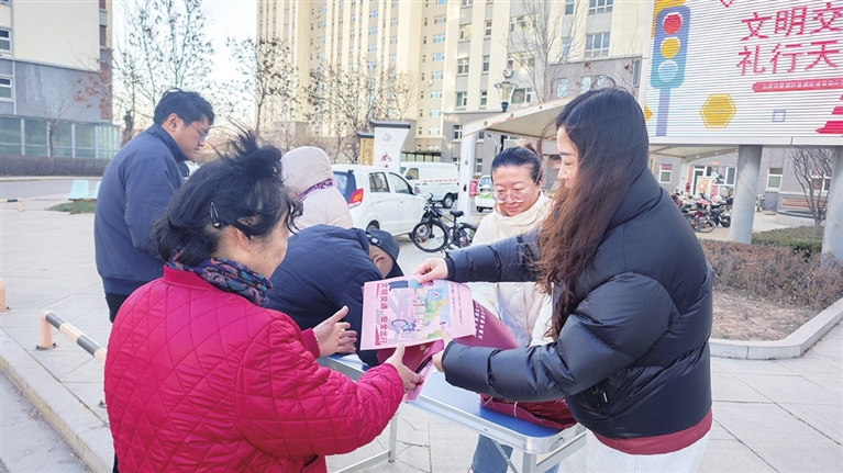 “雨雪天路面湿滑,骑车要放慢速度,戴好头盔才能护好安全”“过马路记得走斑马线,尽量避开早晚高峰”……在辖区人流密集的广场、小区出入口等地的宣传点,志愿者们手持图文并茂的宣传页,向来往居民逐一发放讲解。结合冬季出行特点,志愿者有针对性地普及安全要点,现场解答居民关于交通违法处理的咨询,互动氛围热烈。