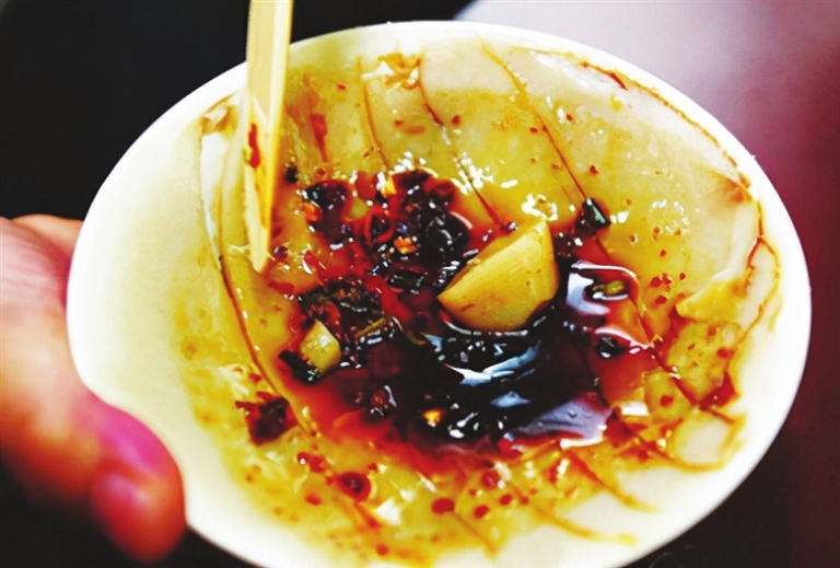 碗脱则又称碗脱儿。上世纪六七十年代,在我的故乡,一副扁担挑子就是一个碗脱儿的小吃摊子。扁担挑子两头的箩筐里,碗口对扣碗口装得满满的。卖碗脱儿的大叔在村口一吆喝,就招来一圈人等着吃。这时,大叔从筐里拿出上面的一个碗,碗是浅底阔口的粗陶瓷碗,碗里是浅青白色的碗脱儿。他用一把小刀,快速将碗脱儿划成扁扁的菱形小块,再拿刀尖插在碗脱儿与碗的粘接处沿碗一转,碗脱儿与碗就剥离开来了。接着,往碗里浇上醋、盐、姜面和蒜泥配成的料汁,再撒上芝麻面,最后拿一根一头削尖的短而细的筷子往碗里一扎,就可以开吃了。用那根筷子将碗脱儿挑起来送到嘴里,那是什么滋味呢?细嫩、滑软、筋绵、清香、爽口,有淡淡的荞麦面特有的味道。