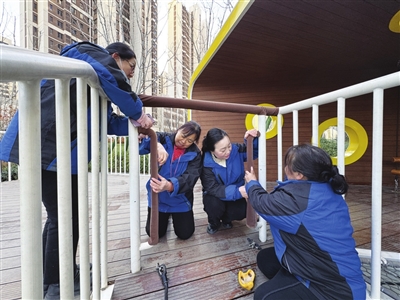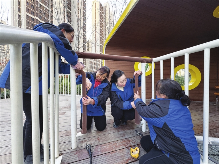 天冷了,孩子们在户外游乐设施上玩耍时,总抱怨金属扶手冰凉。12月9日,安宁街58号院的物业购回棉布材料后,中海社区组织志愿者对扶手进行包裹,并牢牢缝合,暖和又安全。 李涛 摄