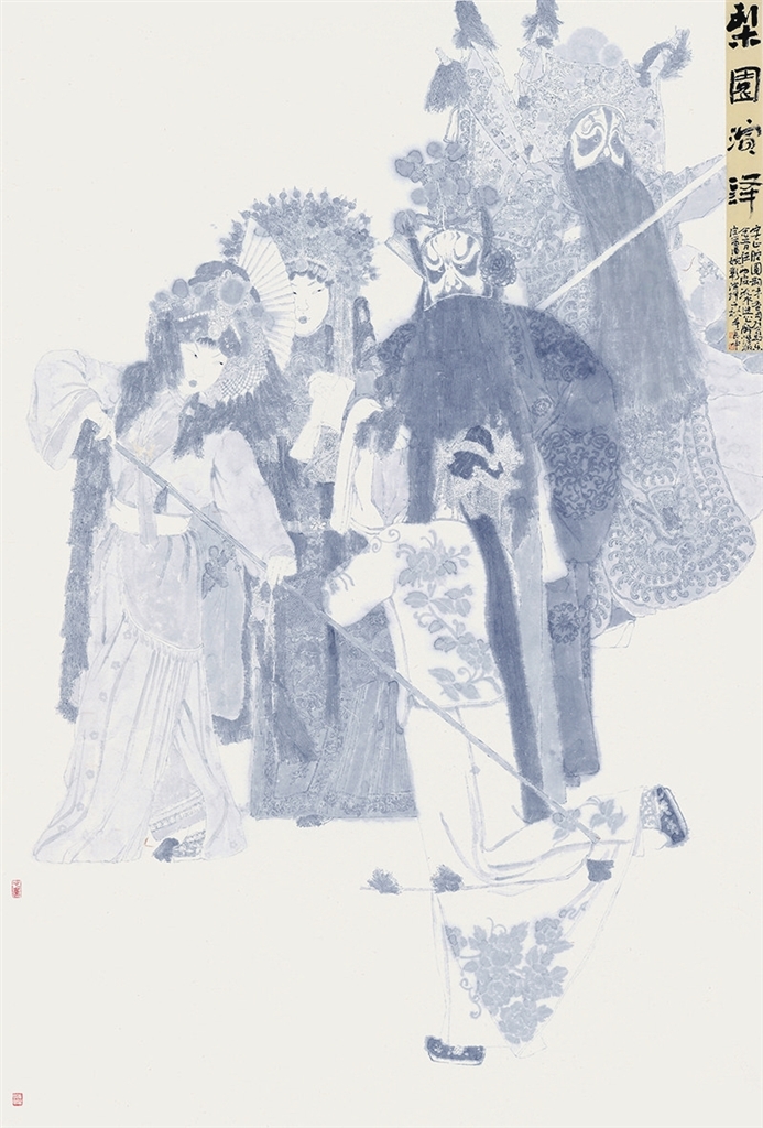 李长平此画构思老到,虚实相间,纵横捭阖。他不受时空限制,重新组合排列,通过新水墨的画法,结合现代构图法则,把不同时代的五位戏曲人物放在同一画面充分演绎,可谓中西合璧,古今兼用。两位净角、三位旦角,远近疏密,高低错落,意境深远,情致悠长。画作虽没有具体的故事情节,却有着具体的人物形象。男女老少,端庄与活泼碰撞,稳重与跳脱统一。表现出一种人来人往、互通有无、流通聚散的群体社会运行状态。