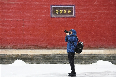 12月13日,市民在山西考古博物馆赏雪。 邓寅明 摄