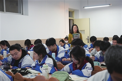 高三年级独门独院的全封闭管理,成了校园里一道独特的风景线。“学生的食宿、教学、自习都在这个院子里完成,既能减少通勤时间,也能帮他们隔绝外界干扰,专心备考。”教务处副主任郭莉介绍,学校还专门设置了主副教室:主教室用于常规上课,副教室则用于开展走班教学、分层教学和考试,有效减少考场布置对学生精力的消耗。此外,自习室整晚留灯,全力满足学生学习需求。