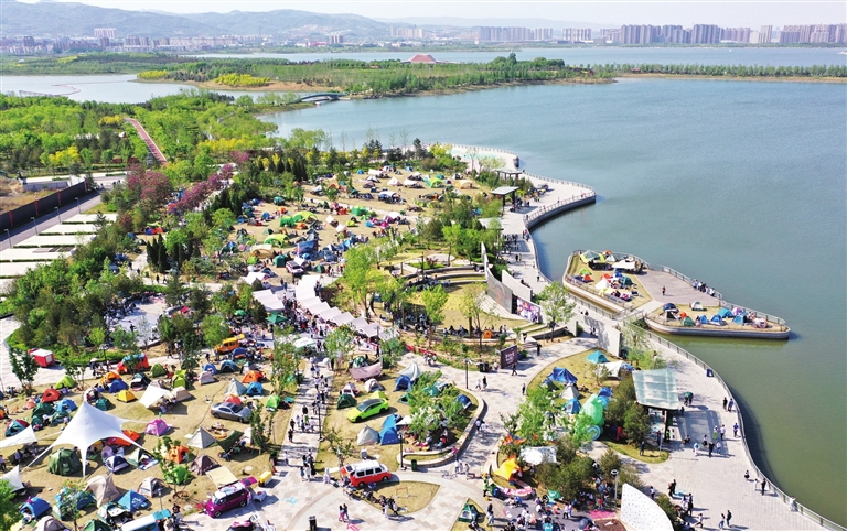 抬头便是郁郁葱葱的西山,低头便是灵动的河水,波光潋滟的水面,翠湖波影,叠石成景,目光所及之处,均是一幅山清水秀的诗意画面。今年10月1日开放的老龙头景区,让汾河景区实现贯穿太原全城的宏伟目标又近了一步。