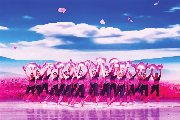在舞蹈编排上,创作团队将山西民间舞蹈的经典语汇与现代广场舞的活力元素有机融合。舞者手执蝴蝶扇,以舒展而灵动的肢体语言,勾勒出一幅“桃花绽放、春满三晋”的动人画卷。服饰设计中点缀的桃花纹样与青白主色调相得益彰,既象征着三晋大地的青山绿水,也传递出淳朴真挚的乡土情怀。演员们动作整齐、舞步刚柔相济,将山西民歌的韵律之美与群众舞蹈的生活气息完美结合,生动诠释了三晋儿女对家乡的深情眷恋与对美好生活的热烈向往。