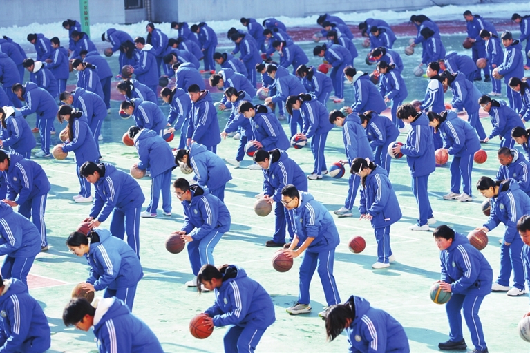 12月16日,进山中学开展以“弘扬教育家精神 推进大思政一体”为主题的办学成果展示活动,内容包括学生风采展示、书画展演、纪念演出等。图为学生们正在展示篮球操。 王韵菲 摄