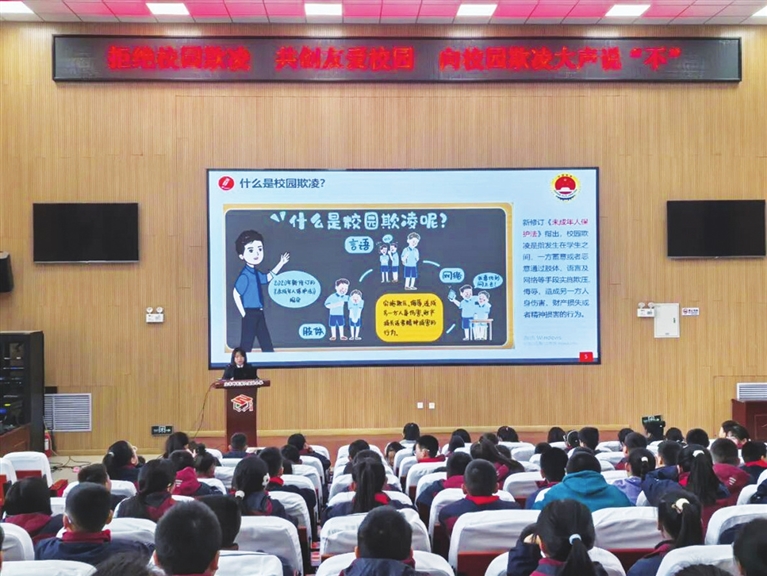 “校园欺凌是指发生在学生之间,一方蓄意或者恶意通过肢体、语言及网络等手段实施欺压、侮辱,造成另一方人身伤害、财产损失或者精神损害的行为。”课堂中,检察干警结合《中华人民共和国未成年人保护法》,通过通俗易懂的语言、真实典型的案例,讲解了校园欺凌的常见形式——从肢体冲突、语言辱骂,到孤立排挤、网络谣言等,让同学们清晰认识到看似“小事”的行为可能带来的严重后果。同时,干警传授了预防校园欺凌的实用方法:遇到欺凌时保持冷静、及时向老师和家长求助,正确运用法律武器维护自身权益,以及不参与、不围观欺凌行为的重要性,引导学生树立“拒绝欺凌、尊重他人”的法治观念。