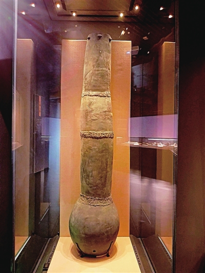 “我”以泥条盘筑法套接而成,上部的管筒由三截连接而成,连接处用两周附加泥条加固;下部为鼓腹罐形,下腹部有5-6个镂孔,底部有一个较大的镂孔。关于“我”如何使用呢?当时先民们将狩猎完的兽皮套接在土鼓上面尖状的部位,用手进行敲击,声音便顺着长长的筒形,传到下方鼓腹罐子中,从镂孔中发出。“我”没有繁复纹饰,身材亦不舒展,却在极简中藏着更原始的古朴之美。当“我”裹着兽皮在高台上发出第一声“嘶吼”,单调却狂放的“嘭嘭”声,是先民驱赶野兽、祈福安康的虔诚祈愿。