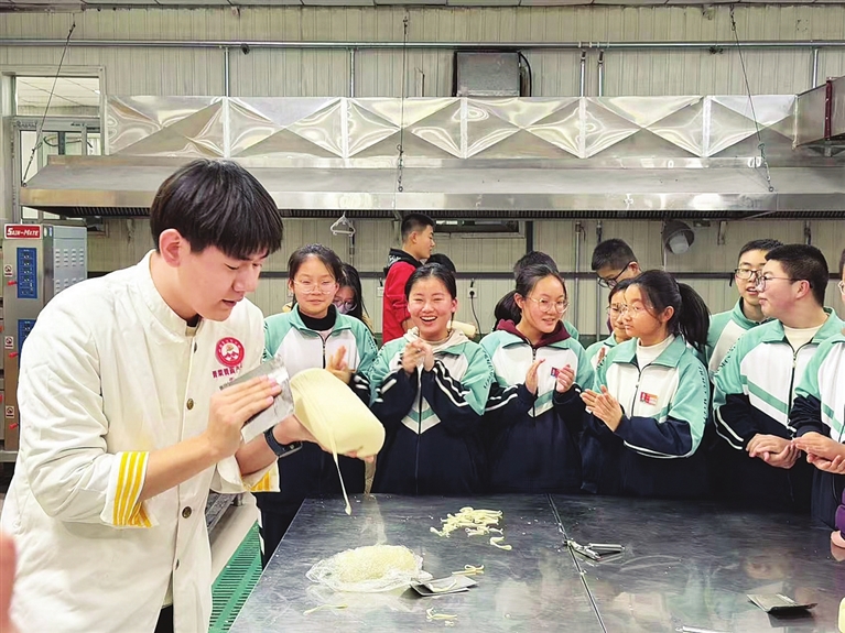 参观之余,中学生们还品尝了职校学生现场制作的地道热菜过油肉、清爽可口的冷菜鸡丝凉面等,鲜香的味道让人回味无穷。在实践体验环节,中学生们热情高涨,纷纷参与到中式面点刀削面、烘焙戚风蛋糕以及蛋糕裱花的制作中。