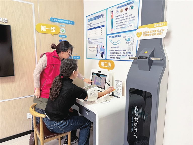 “体重正常,血压偏高,您记得按时吃药。”在太白街社区的健康角,退休医生张兰英看着76岁刘美珍测完的数据,细心地叮嘱。经常有居民走进这个30平方米的小微空间,给自己做个自助体检。