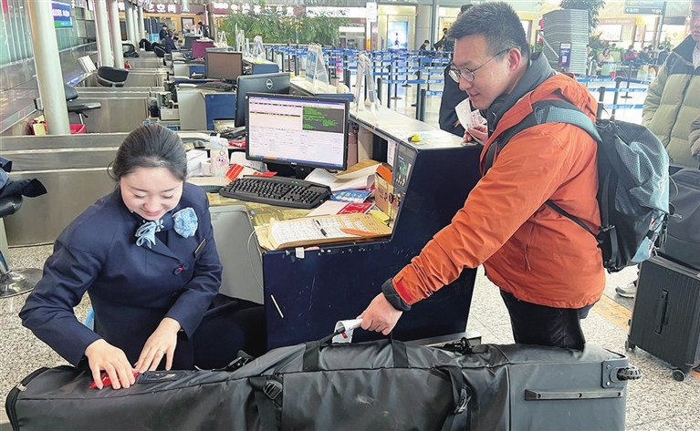 周璇几乎每年都去外地滑雪,会随身携带全套雪具。以往,行李箱加上滑雪板、雪鞋等装备总是超重,需要额外支付费用。而且,滑雪板价格不菲,她总担心托运时会被磕碰、磨损。而这一次,到值机柜台咨询后,地服人员告诉她不仅能免费托运,还会全程人工面对面交接,全力保障雪具安全。