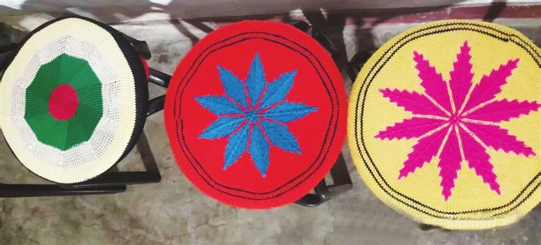 再追问织法,她们便比画着解释:“用的是减针的法子,从外圈往里面打。没事的时候,大伙凑在一起,你教我两针,我给你看个花样,照着图样子慢慢织。家里的毛线头全找出来,先配色,尽量让图案齐整些;要是自家的毛线颜色不合适,就你家匀点红的,我家拿点蓝的,相互调配着来。也正因如此,织出来的座套少有重样的——毕竟每家的毛线头数量、颜色都不一样,凑出来的花样自然各有各的巧。”她们还说:“织的时候有两个小讲究:最外圈要特意留几个窟窿眼,是为了穿松紧带,套在凳子上才不容易滑;织到最里面,减针减到没法再减,这一个座套就算完工了。”