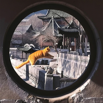 正是这种恰到好处的克制,让它们成为晋祠古建最温柔的守望者。橘猫蜷在周柏虬结的根须间,暖绒的毛色与老树皮的苍褐相融,像是古树结出的一枚金色的果实;灰猫蹲在唐叔虞祠镂空的雕花窗棂上,斑驳的皮毛与木格的纹理交错,成了窗景里会呼吸的纹样;当猫踮脚蹭过铁人的铠甲,那冷硬的古铁仿佛也因这软萌的触碰,退去了三分肃杀。摄影师张先生每年都会来晋祠拍猫,他珍藏着一个难忘的镜头:“有一回,我透过白鹤亭那扇圆形窗取景,恰好拍下一只橘猫凌空跃起的瞬间——它浑身的橘毛在光里发亮,身下是难老泉清潭的粼粼波光,背后的水母楼、难老泉亭,连同这跃动的猫、清冽的潭水一同被框进圆窗里。那一刻,鲜活的生灵与千年的泉、古朴的楼相融,竟把晋祠的灵秀与温柔都糅在了一起。”