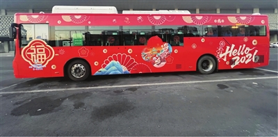走近这辆主题公交车,扑面而来的是热烈喜庆的“中国红”。车辆以红色为主色调,象征着红火、吉祥与希望。车厢内外巧妙融入丰富的传统新年元素与本土文化符号:精致的窗花剪纸图案点缀车窗,“福”字、“春”字、生肖祥瑞等造型栩栩如生,传递着新春的美好祝福;车窗及车身海报上,印着太原市代表性特色建筑的轮廓剪影,古今交融的设计,让乘客在领略传统节庆文化魅力的同时,也能深切感受到城市发展的蓬勃脉动。