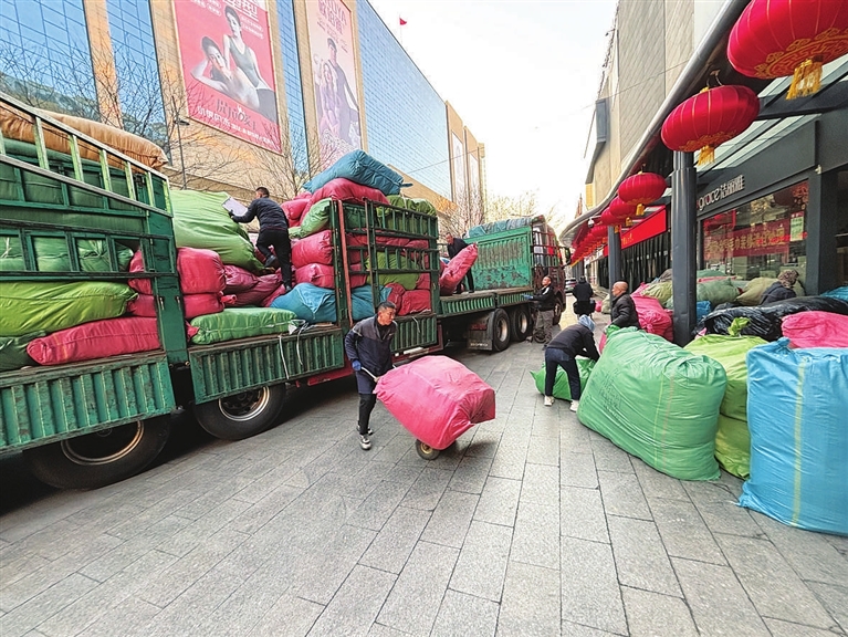 12月30日,省城新东城服装批发市场,商户正忙着卸货。元旦小长假临近,各商家忙补货,迎接两节消费高峰。 邓寅明 摄