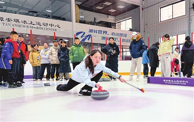 1月3日,由市体育局组织的“火力全开”冬令营的90余名青少年营员在小店区谭安琪冰上运动中心体验冰壶运动。 邓寅明 摄