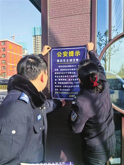 入冬以来,金胜派出所针对群众时常忘记锁车门,夜间易发生“拉车门”盗窃案的情况,组织民、辅警根据不同时段、不同区域特点,有针对性地对小区停车场、景区停车场、存在监控盲区的老旧小区以及路边停车位等区域开展巡逻检查,在小区大门口、停车场出入口等显著位置张贴“防盗提示”宣传海报,提醒居民提高防范意识,注意保管好贵重物品。同时结合真实案例,向群众普及“拉车门”“地下车库盗窃”等盗窃犯罪类型,讲解偷盗者惯用的盗窃伎俩,并现场支招如何防盗。元旦假期,派出所民、辅警也不休息,重点加强景区景点的巡逻防控工作,对各景区停车场内停放车辆进行安全检查,共发现27辆小轿车存在车门未落锁的情况,其中2辆车中存放有手机、笔记本电脑等贵重物品。针对车门未落锁的市民游客,民警均第一时间拨打电话提示车主及时上锁。