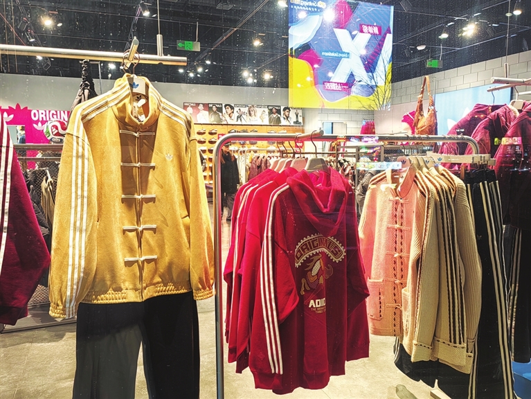 “这款休闲服太有设计感了,穿上一定很潮。”1月3日晚,市民周超路过亲贤街上一家服装专卖店,临街橱窗里展示的一件夹克款的“黄马褂”,立刻吸引了他的眼球。这件衣服形似夹克运动衫,但拉锁外有一排中式盘扣,中西元素结合,别有一番风情。另一款马形图案的中国红帽衫,他也非常喜欢。