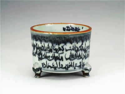 郑和七下西洋,主要货物有瓷器、香料、茶叶、丝绸等,交流的主要对象为伊斯兰世界,而这件青花瓷白底蓝花装饰效果的筒式三足炉正是那个时代的见证。