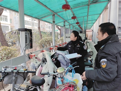 1月4日,老军营派出所民警在居民区排查电动自行车消防安全隐患,对私拉乱接的充电线路当场拆除,并讲解“飞线充电”的火灾隐患和安全危害,引导居民规范停放电动自行车,确保消防通道和安全出口畅通。 辛欣 摄
