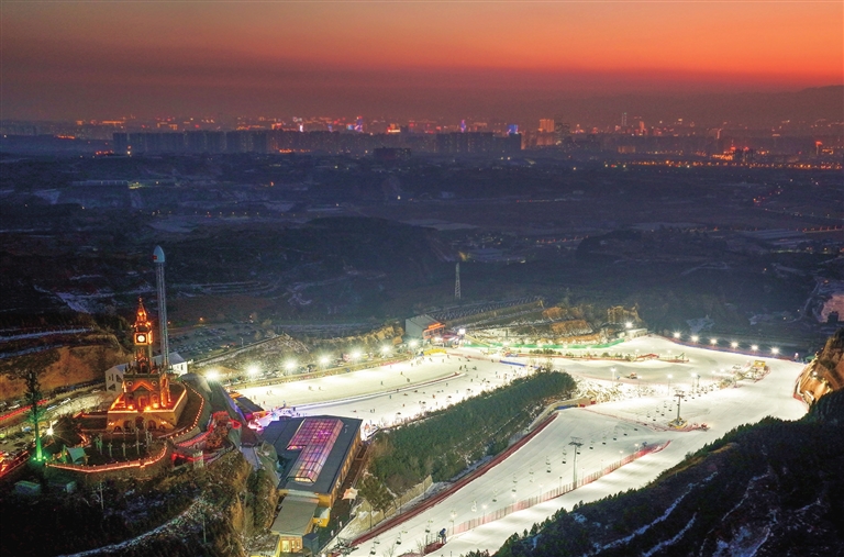 伴随着城市灯光与星空,夜间滑雪以独特的景致和新奇的体验,成为我市冰雪运动新时尚。图为1月6日,杏花岭区某滑雪场灯火璀璨。