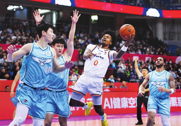 1月7日,在2025-2026赛季中国男子篮球职业联赛(CBA)常规赛第12轮比赛中,上海久事队客场90比73战胜青岛崂山啤酒队。 新华社 发