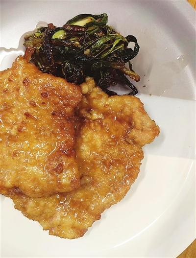 6.炒锅中放少许油,先下葱白,再放葱绿,最后放入炸好的肉排。把调好的料汁均匀浇在肉排上,小火焅4分钟,翻面后再浇一次料汁,继续焅4分钟,最后开大火收汁即可。