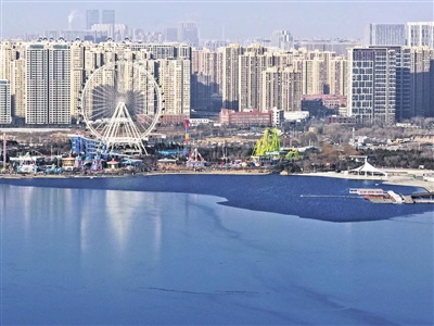 1月11日,晋阳湖公园湖面的冰与水呈现浑然天成的“双色镜面”冬日景观。 王韵菲 摄